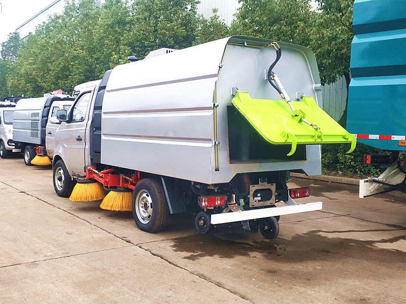 掃路車采用“中置四立掃+后置吸盤”的布置結構,掃刷是用來清掃地面的垃圾及污垢,作業(yè)時掃刷由外向內把垃圾集中掃到車輛底部,再通過吸嘴把垃圾吸入到垃圾箱內。
