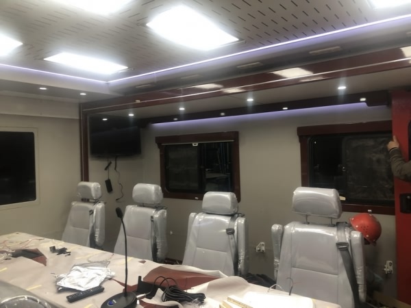 多功能應(yīng)急搶險(xiǎn)救援指揮車是采用東風(fēng)天錦、重汽豪沃、進(jìn)口奔馳等底盤上進(jìn)行改裝,能同時(shí)容納 7~10 人開會(huì),辦公。改裝后安裝了衛(wèi)星通信系統(tǒng);音視