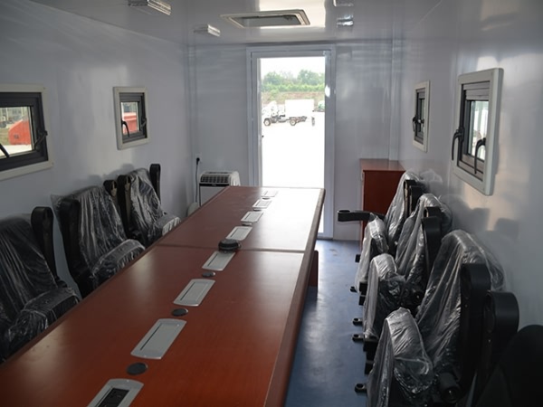 大型移動(dòng)指揮車(chē)一般會(huì)配置6部以上的無(wú)線電車(chē)載基臺(tái),有些會(huì)多達(dá)10部以上,能夠協(xié)調(diào)眾多的單位。同時(shí)大型移動(dòng)指揮車(chē)還要安裝供車(chē)內(nèi)通話使用的通訊系統(tǒng),滿足指揮車(chē)內(nèi)部各個(gè)功能區(qū)的聯(lián)絡(luò)需要。 多數(shù)移動(dòng)指揮車(chē)還會(huì)安裝多部地面線路通訊交換機(jī)和無(wú)線通訊車(chē)載基站,既可以連接現(xiàn)有有線通信線路,也可以搭建臨時(shí)的無(wú)線通信網(wǎng)絡(luò),保證指揮部門(mén)多線路的通信需求。尤其是面對(duì)互聯(lián)網(wǎng)應(yīng)用的發(fā)展,移動(dòng)指揮車(chē)還要搭載移動(dòng)寬帶網(wǎng)絡(luò)服務(wù)設(shè)備。因此一臺(tái)大型移動(dòng)指揮車(chē)就是一臺(tái)應(yīng)急通信車(chē)。這在通信不暢的山區(qū)荒野和自然災(zāi)害現(xiàn)場(chǎng),具有重要意義。通常的大型移動(dòng)指揮車(chē)都將指揮設(shè)置在車(chē)體后部,同時(shí)兼做會(huì)議室的功能,下圖就是面向車(chē)體后部的車(chē)內(nèi)視圖,對(duì)于一些外形尺寸受限的中型移動(dòng)指揮車(chē)而言,在通訊聯(lián)絡(luò)區(qū)域之后,一般是如下圖中間位置那樣設(shè)置一個(gè)建議的休息空間用作會(huì)議室,那些大型移動(dòng)車(chē)則要在類似的位置安裝更多新奇的裝備。